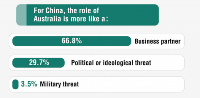 66.8%的受访者 认为澳洲主要是中国的贸易伙伴,剩下的 33.2%的受访者将澳洲视作威胁,主要源于政治和意识形态原因。
