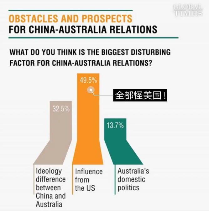 49.5%的受访者认为是美国的影响,32.5%受访者认为是中澳意识形态的差别,仅有13.7%的受访者认为是澳洲国内政治形势。