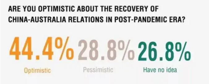 44.4%的受访者 表示乐观,他们认为中国和澳洲之间将会恢复良好的关系,28.8%的受访者表示悲观,26.8%的受访者表示没有任何想法。
