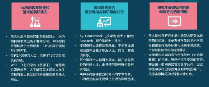 澳大利亚大学的 授课型硕士课程注重就业,不少专业课程设置中涵盖了职业认证、实习、实践项目等。研究型硕士以科研为导向,旨在培养优秀的科研人才,由导师带领开展相关科研项目。