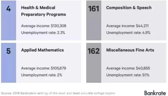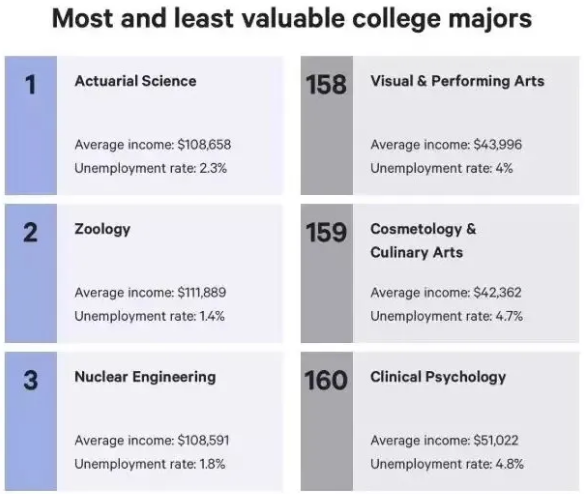 倒数五名的专业分别是:杂项艺术,写作和演讲,临床心理学,美容服务和烹饪艺术,视觉和表演艺术。