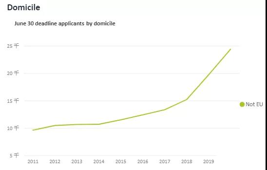 结合之前的统计数据,可以发现:中国大陆学生(24430)占非欧盟申请人数(89130)的三分之一。