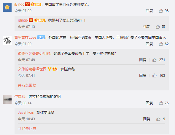 看到这则消息,众多学生和家长纷纷在微博评论区留言祝福,提醒中国留学生在国外注意安全:
