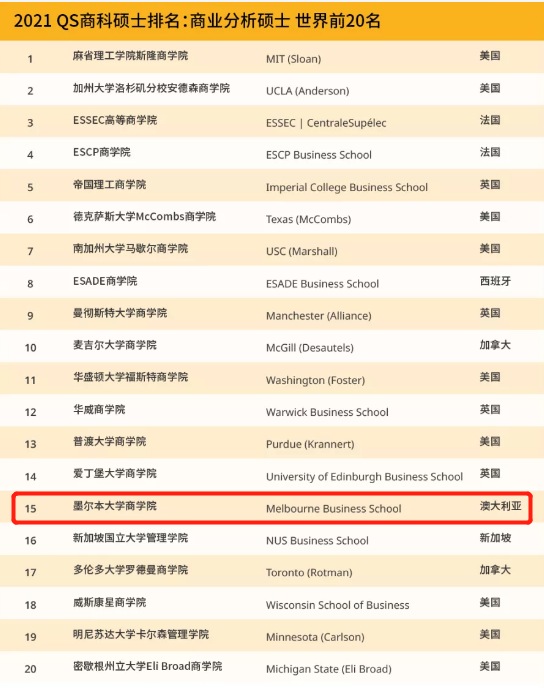随着网络的高速发展,全球已经全面进入信息数据时代,商业分析人才也越来越受到社会的青睐。在这一领域,澳大利亚墨尔本大学商学院位列第15位,跻身超一流梯队。