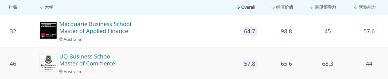在最新的金融硕士排名中,澳洲有两所大学进入世界前100,分别是:麦考瑞商学院,排名全球第32和UQ商学院,排名全球第46。
