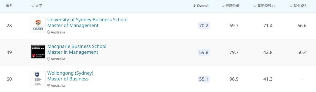 管理学硕士世界排名前100名中,澳洲也有不错的成绩,总共3所大学上榜,分别是: