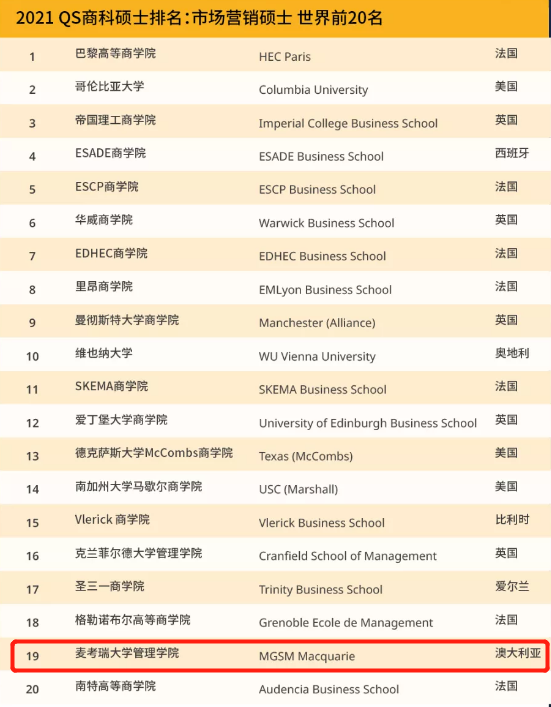 在市场营销硕士排名中,澳大利亚麦考瑞大学商学院入围世界前20,名列第19。