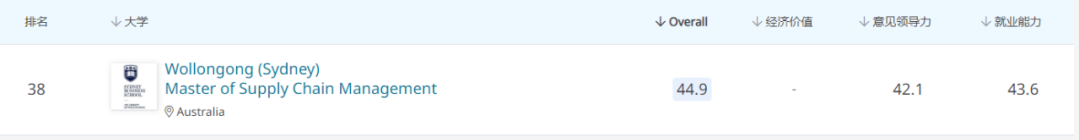 供应链管理硕士排名中,卧龙岗大学悉尼商学院上榜,排名全球第38。
