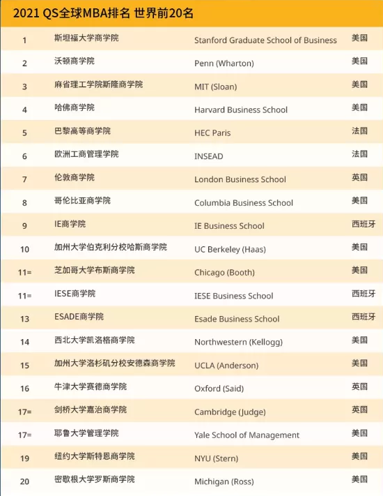 QS还公布了全球MBA排名,美国的斯坦福大学商学院、沃顿商学院和麻省理工学院斯隆商学院瓜分前三甲。