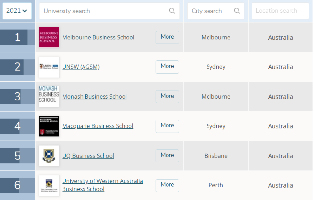 QS也公布了大洋洲十大MBA项目,墨尔本大学商学院、新南威尔士大学商学院(AGSM)和蒙纳士大学商学院名列前三。