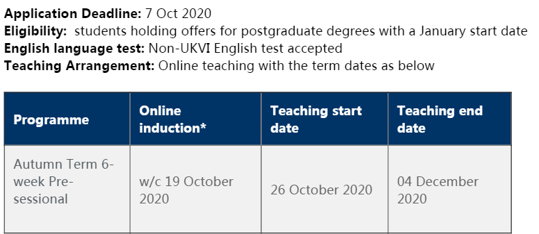 伦敦国王学院秋季语言课申请开放,截止日期为 10 月 7 日,学生需持有 2021 年 1 月入学的录取通知,可使用非 UKVI 语言考试,具体开学日期如下: