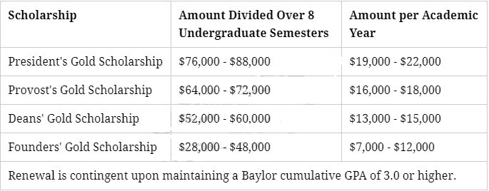 贝勒大学这四项奖学金就是根据 SAT/ACT 分数来确定,而且贝勒有一个奖学金估算器,你可以用它来预估自己的奖学金数额(网址: https://www.baylor.eu/estimator/ )。