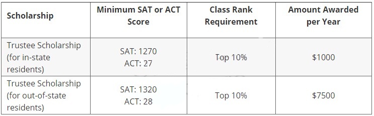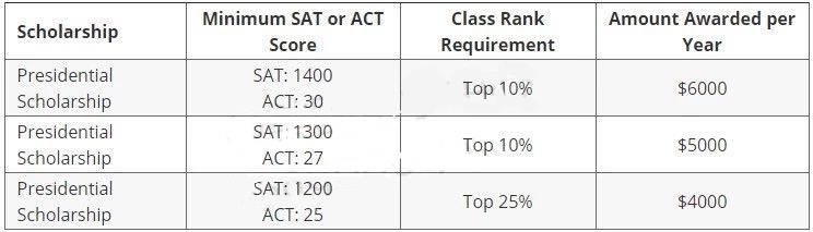 如果你的 ACT 为 36 ,并且排名很高( 5⁄500 ),你就可以获得每年 22000 美元的校长奖学金;如果是 34 分也可以拥有同样数额的奖学金;但是 32 分则只有 20000 美; 28 分是 16000 美元。虽然看起来差距不大,但是 ACT 从 28 分增加到 32 分可以每年多赚 4000 美元。