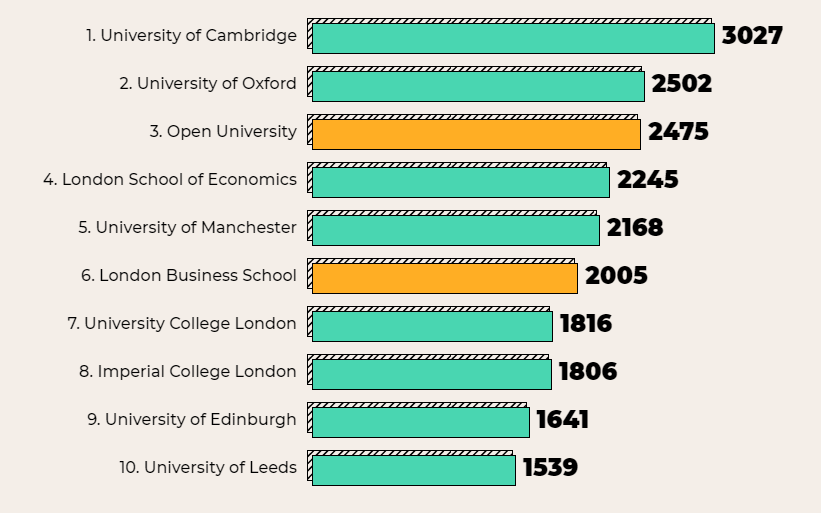 人数最多的是剑桥大学,目前共有3027名毕业生在被所调查的知名技术企业中工作。除英国G5院校外,曼彻斯特大学、爱丁堡大学、利兹大学、伦敦商学院等院校上榜。