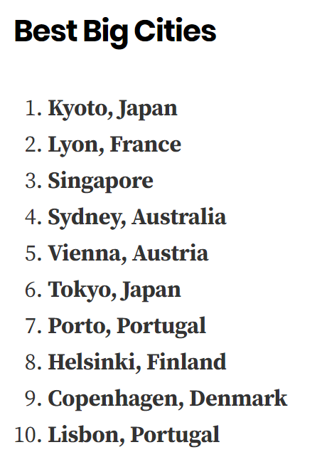 今年的入围名单还包括奥地利维也纳、日本东京、葡萄牙波尔图、芬兰赫尔辛基、丹麦哥本哈根以及葡萄牙里斯本,分为位居5-10名。