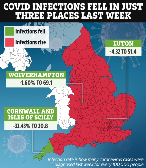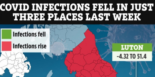 在贝德福德郡卢顿,Covi-19的每周病案率从每10万人中的53.7下降到51.4,下降了4.3%。
