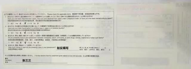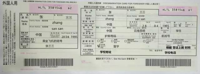 ●在飞机上领取并填写出入境卡及携带物品申请书 (如下图) 。