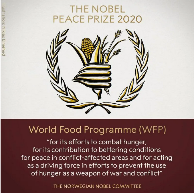 10月9日,2020年诺贝尔和平奖揭晓,奖项被授予 联合国世界粮食计划署(WFP) ,以表彰其“在对抗饥饿问题上所做的努力、为改善遭受冲突影响地区的和平条件所作的贡献,以及其在防止将饥饿问题作为战争和冲突的武器方面,发挥的推动作用”。