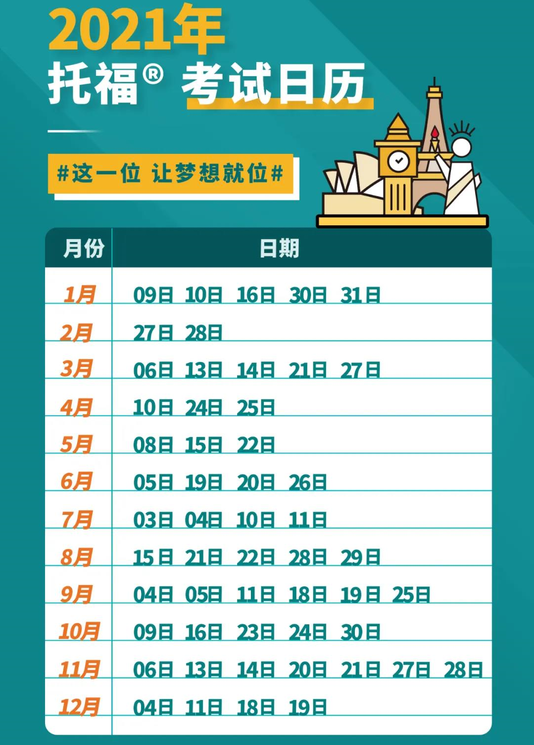 2021年托福考试考位已经正式开放 !全年共暂计开放53个考试日期,具体考试日期安排请见下图。请考生们尽快前往官方网站https://toefl.neea.cn/报名锁定考位!