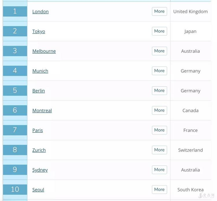 在这次排名中,前三位和去年一样,分别是 英国伦敦、日本东京和澳大利亚墨尔本 ,其次分别是慕尼黑、柏林、蒙特利尔、巴黎、苏黎世、悉尼、首尔。