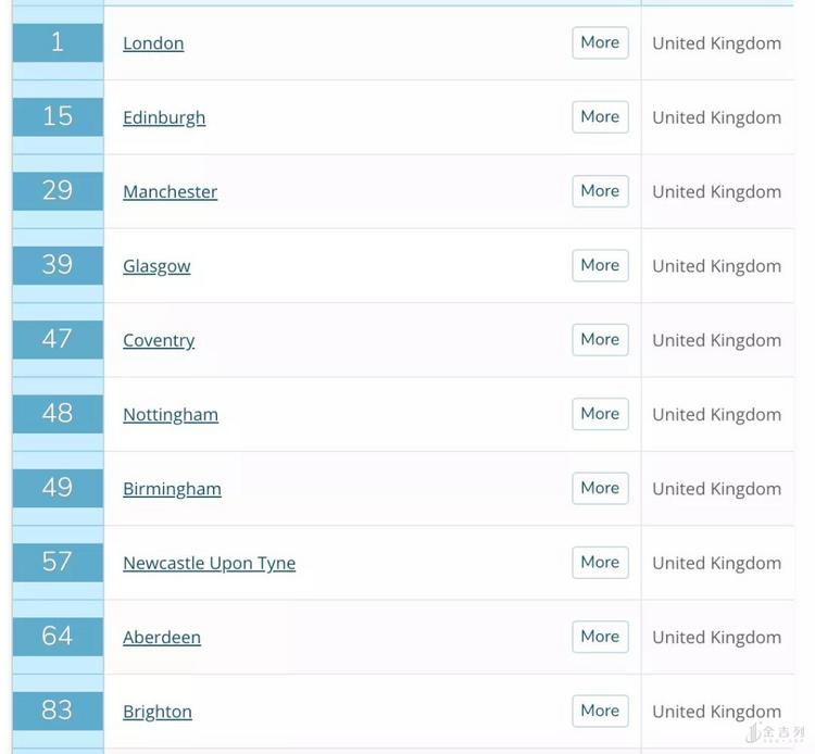 大学排名: 该项评分主要考察这座城市的大学在QS世界大学排行榜的排名。