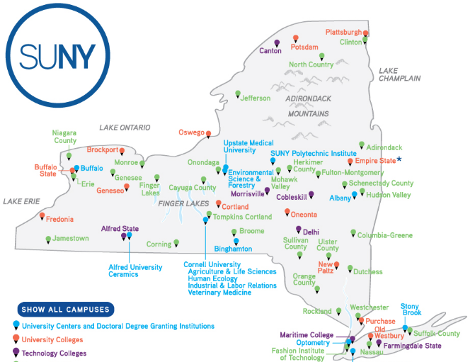 纽约州立大学系统SUNY——为美国最大的公立大学系统,SUNY不是一个独立的大学,而是一个由64个校区组成的大学系统,其中包括有研究型大学、文理学院、社区学院、技术学院等。来看看下图这64个院校的分布:其中蓝色的是大学中心和研究生博士院,橘色的是文理学院,紫色的是技术学院,青色的是社区学院。