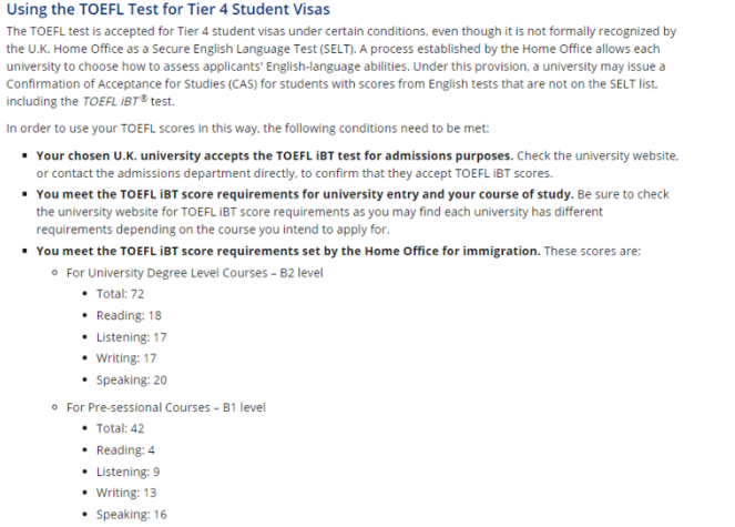 2020年4月20日,英国内政部在 the UK Home Office官网发布的「疫情期间Tier 4学生签证申请指南」中规定,托福成绩达到B1 level(托福42分以上)就可申请英国大学语言课与Tier 4学生签证。