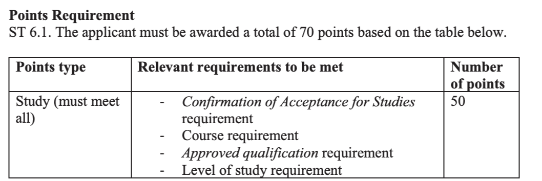 同时,学生签证申请人积分需满70分,可获得相应的积分要求如下表: