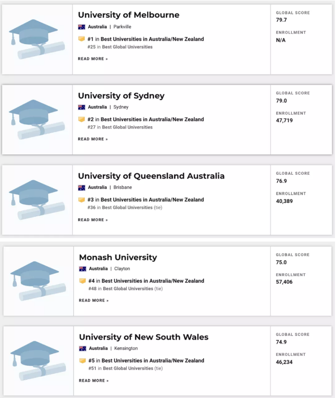 澳洲八大全部进入全球前100,墨尔本大学再一次拿下USNEWS榜单的澳洲第一,蝉联成功!