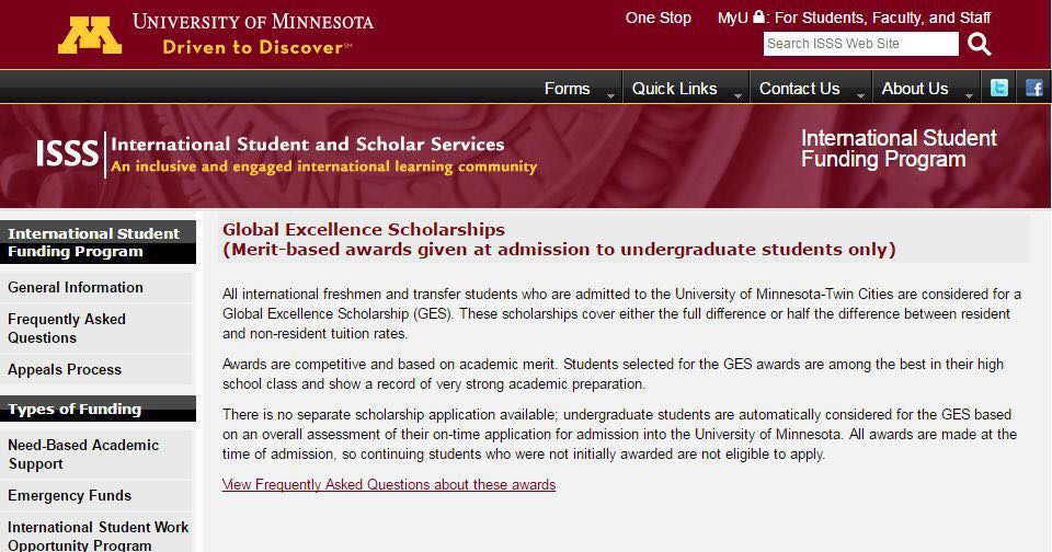 申请截止日期: 2018年11月1日,详细戳https://isss.umn.eu/programs/fa/Global-scholarships.html