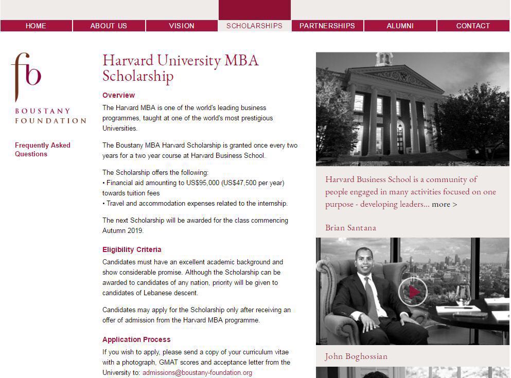 Boustany Founation面向哈佛商学院MBA课程学生设立奖学金,这个项目每两年颁一次,包含90000刀学费+差旅费+住宿费(每年45000美元),要求申请者具备优秀学术背景,不限国籍,申请时需提交成绩单、GMAT或GRE分数,雅思不低于7.5或托福不低于109。