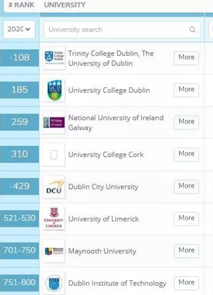 爱尔兰目前共有8所综合性大学,分别是:圣三一大学、都柏林大学、科克大学、高威大学、梅努斯大学、都柏林城市大学、利莫瑞克大学和都柏林理工大学。2020年QS最新的排名情况如下: