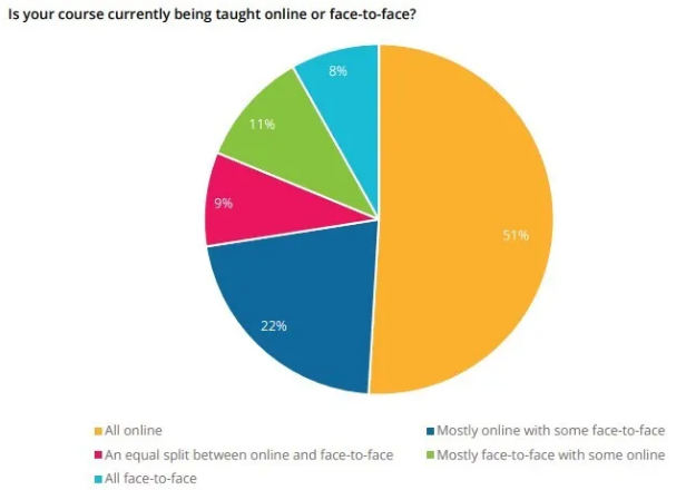 其中有51%的学生正经历纯网课制教学。 有趣的是,有相当一部分的人仍然选择了线下授课作为他们学习的一部分,有22%的学生是以网课为主导配合部分线下课程;只有8%的学生仍然是全线下授课的。