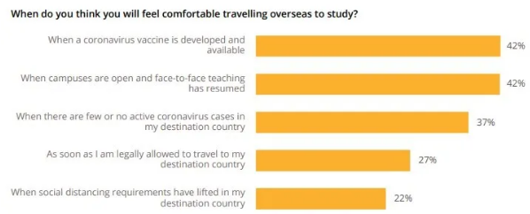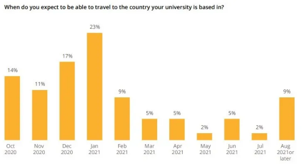 这一数据表明, 大约2/3的学生希望在明年1月之前回到大学所在地区继续学习。 虽然全球COVID-19的病例仍在增长,但是国际学生对旅行计划是持有一个乐观态度的。