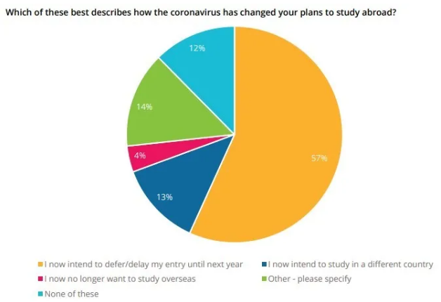 留学生群体中,有57%决定延迟入学到2021年,有13%的计划去其他国家就读, 只有4%的人决定放弃留学 。