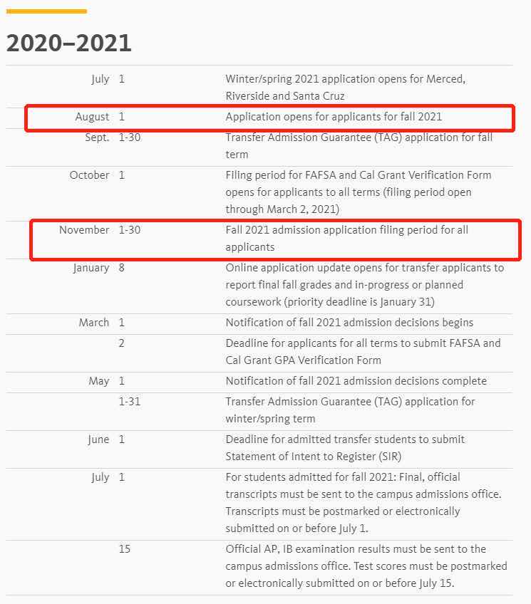 加州大学的申请与绝大部分的美国大学的申请不同,加州大学系统的申请是不分提前申请(ED/EA)和常规申请(RD),所有加州大学(UC)统统都只有一个秋季申请时间——11月1日—11月30日。因此,接下来的一个月也被称为“加州月”,大家有想进的学校可以开始准备申请了。