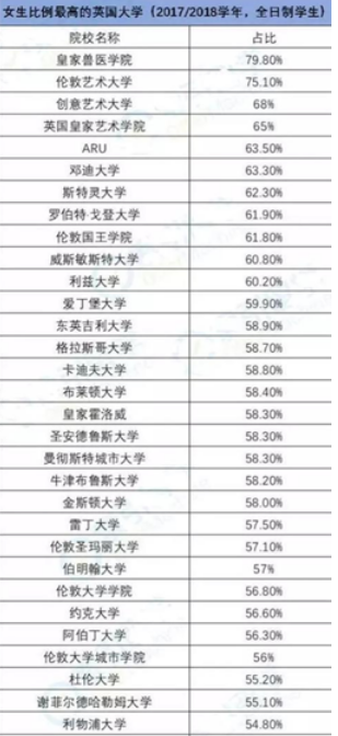 在国内,每年开学季或者毕业季,关于高校男女比例的话题都会时不时上个热搜。有些学校男女比例差距巨大,比如42:1,甚至60:1……而这种情况在国外似乎也不新鲜了,早在几年前,英国高教局就对高校男女比例做了分析,当时女生人数占比最多的高达79.8%,世界排名比较靠前的几所院校占比分别为:伯明翰大学57%、杜伦大学55.2%、伦敦政治经济学院53.6%等。