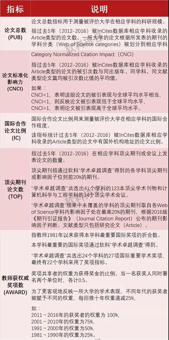 不同于其他排名,上海软科排名更侧重 学术 方向。其排名算法中, 论文总数、论文标准化影响力、 国际合作论文比例 、 顶尖期刊论文数 、教师获权威奖项数 成为考察的重点指标。
