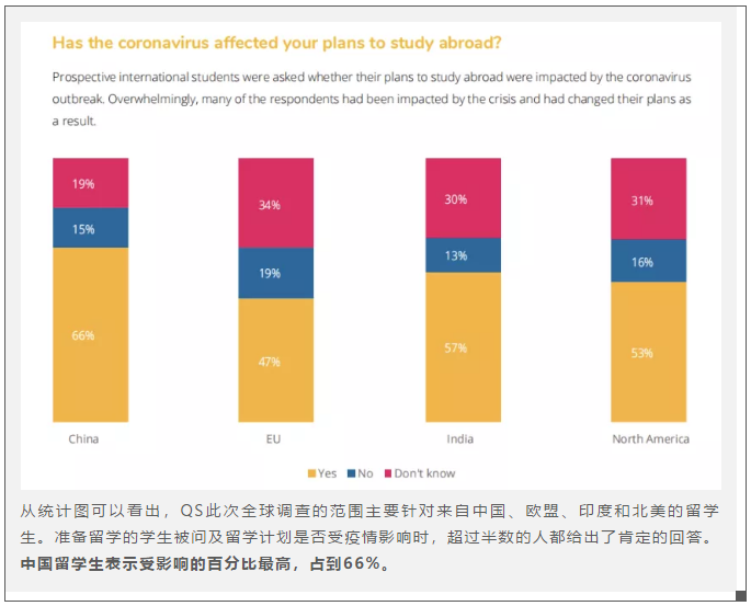 从统计图可以看出,QS此次全球调查的范围主要针对来自中国、欧盟、印度和北美的留学生。准备留学的学生被问及留学计划是否受疫情影响时,超过半数的人都给出了肯定的回答。中国留学生表示受影响的百分比最高,占到66%。