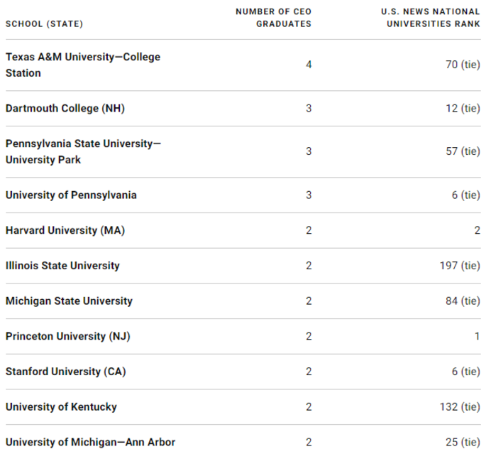 USNews根据今日公布的《财富》500强数据,统计了前100名CEO的毕业院校,结果显示, 德州农工大学排第一,该校有4名毕业生上榜TOP100。 分别是埃克森美孚(Exxon Mobil)、信诺(Cigna)、菲利普斯66 (Phillips 66)和哈门纳(Humana),基本都在前50。