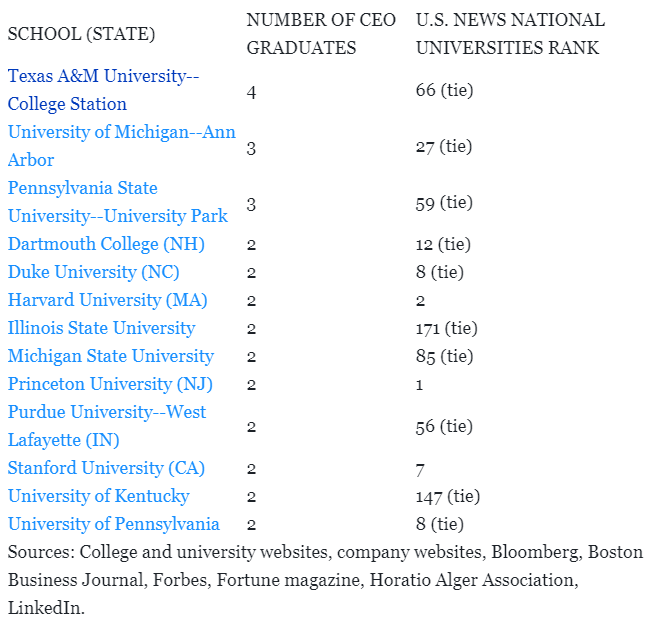 常春藤盟校的表现并非最佳。在《财富》500强榜单 前10位的CEO中,有8位曾就读于公立大学,一位毕业于常春藤盟校 ,还有一位毕业于美国之外的国际名校。