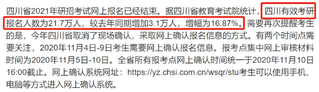 四川省教育考试院统计,四川有效考研报名人数为21.7万人,较去年同期增加3.1万人,增幅为16.87%。