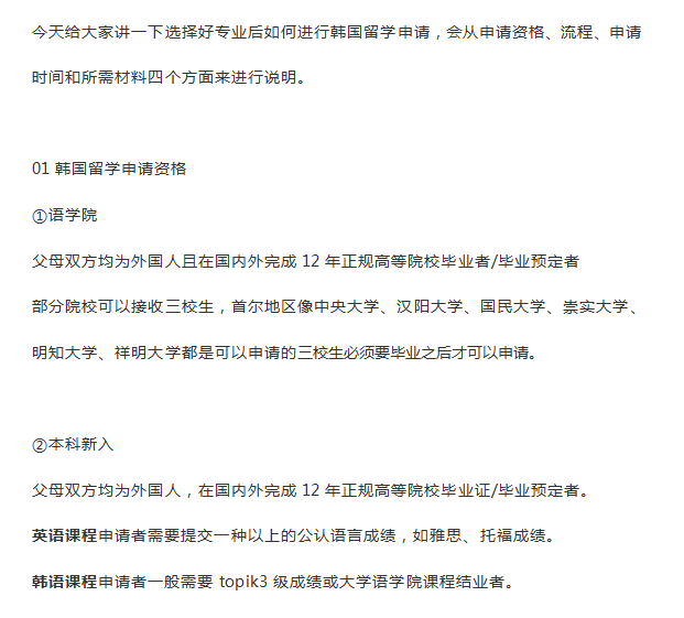 今天给大家讲一下选择好专业后如何进行韩国留学申请,会从申请资格、流程、申请时间和所需材料四个方面来进行说明。