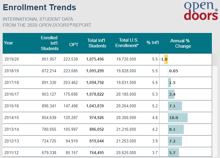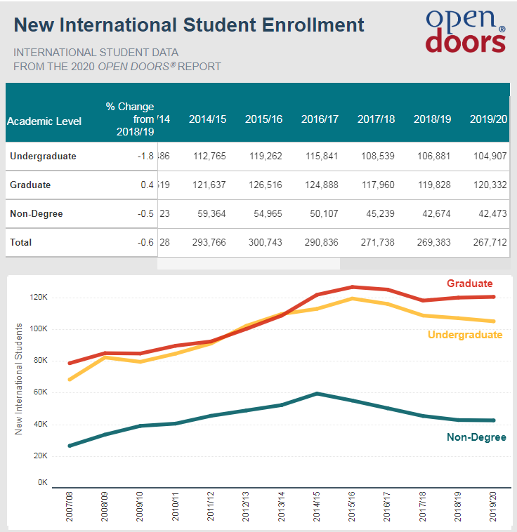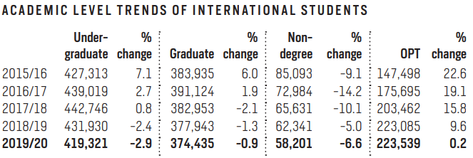 - 受特朗普政府先前一系列政策的影响,2019/20学年赴美留学的国际生首次下降!
