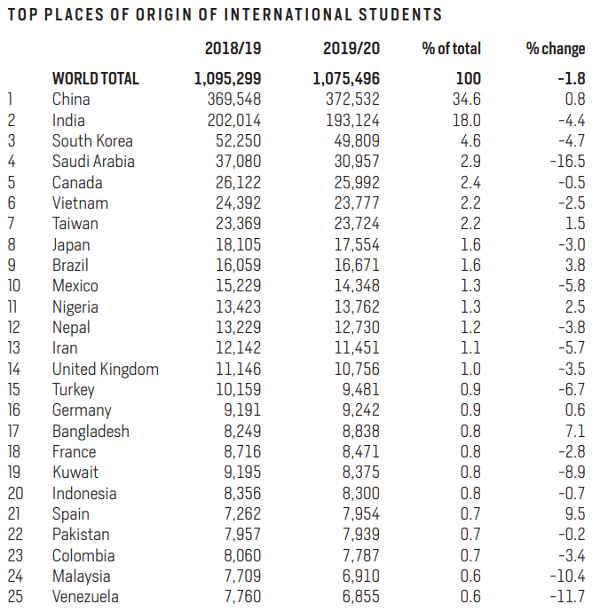 毫无意外,中国连续第11年成为美国最大的国际学生来源国,2019/20学年有372,532名学生就读于本科、研究生、非学位和选择性实践培训(OPT)项目,比2018/19学年增加了0.8%。中国学生数量庞大,占到全部国际生数量的34.6%。三大生源国中,除了中国,第二第三分别是印度和韩国。根据数据显示,中国学生总数大约是印度学生的2倍,而是韩国学生的7倍。接下来在美留学生人数最多的依次是沙特阿拉伯、加拿大、越南、中国台湾、日本和巴西,与前几年情况类似。