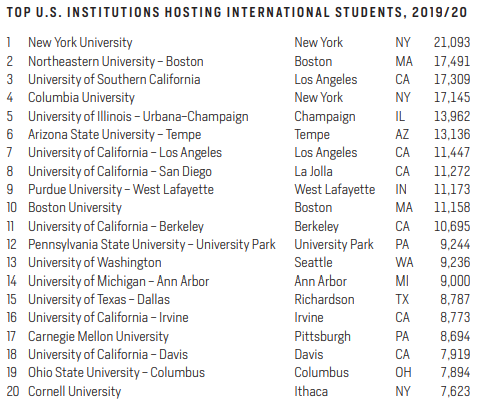 纽约大学连续七年国际学生人数排名第一,东北大学仍然紧随其后,是国际生第二喜欢的高校。前十名还有:南加州大学、哥伦比亚大学、伊利诺伊大学香槟分校、亚利桑那州立大学、加州大学洛杉矶分校、加州大学圣地亚哥分校、普渡大学西拉法叶分校和波士顿大学。