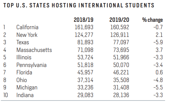 跟去年一样,吸引留学生最多的州是加州、纽约州、德克萨斯州、马萨诸塞州、伊利诺伊州、宾夕法尼亚州、佛罗里达州、俄亥俄州、密歇根州和印第安纳州。我们可以看到,第一名的加州国际生人数虽然相对减少了一点点,但这并不妨碍国际生对加州的喜爱。气候温暖的加州有著名的世界级学府,也有沙滩、大海,有灯火辉煌的高楼和车水马龙的街道,有好莱坞和主题乐园,更有无数学子向往的硅谷~而纽约作为国际金融中心,有华尔街,有世界500强的总部,也有中国人最喜爱的华尔街,有Queens,有布鲁克林大桥,是追梦的地方,当然也有Shake Shack。去纽约的国际生增长2.1%。其中大多数国际生都就读于纽约大学,哥伦比亚大学,纽约州立大学布法罗分校和康奈尔大学。第三名的德州则减少了5.9%,而去年这一数据仅为-2.9%,前年是-0.9%。麻省作为美国东部颇具精英式教育风格的一大学术重地,有着诸多世界顶尖知名大学,如:哈佛、MIT、波士顿学院、塔夫茨大学、威廉姆斯学院、阿姆斯特学院等,自然颇受国际生的喜爱,涨势明显,为3.7%。