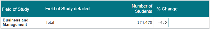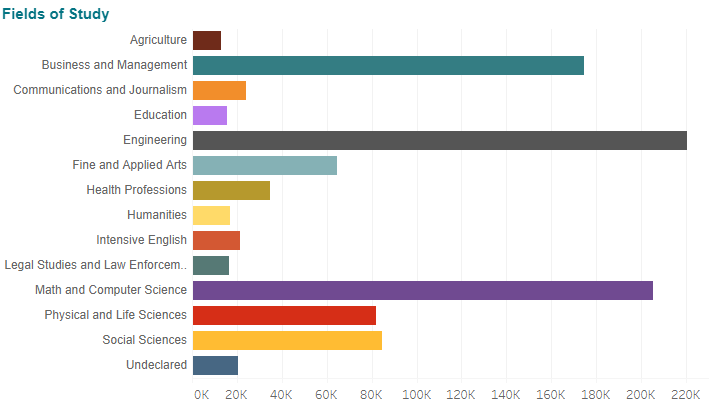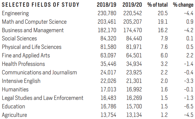 商科虽然是国际生的热门专业,但是同比下降了4.2%,174,470人,占到总数的16.2%。相比去年,整个占比都有所下降。