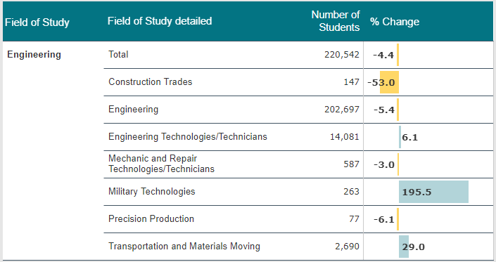 此次下降幅度最大的是建筑专业,降幅高达53%;其次就是通信技术,降幅20.9%。此外,教育专业人数也在减少。