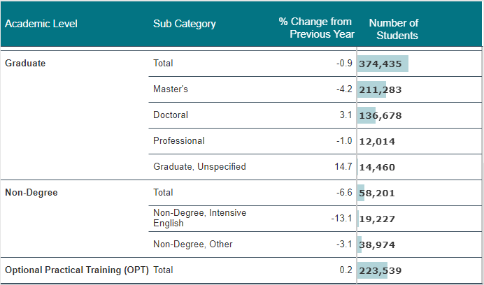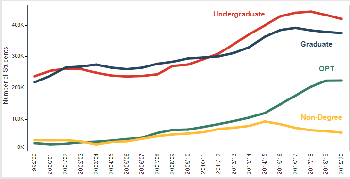 正常情况下,允许STEM学生在完成学业后36个月内留在美国接受选择性实践培训的政策变化,可能会继续推动OPT项目学生人数的增长。但由于特朗普政府的一系列限制,2019/20学年的增长幅度非常小。数据显示,OPT项目学生人数增加了0.2%,达到223,539人。